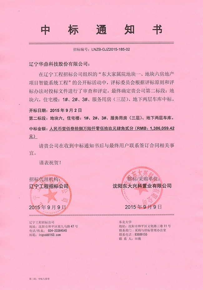 東大家屬院地塊一、地塊六房地產(chǎn)項(xiàng)目智能系統(tǒng)工程項(xiàng)目第二標(biāo)段我公司以1386059.42元中標(biāo)。